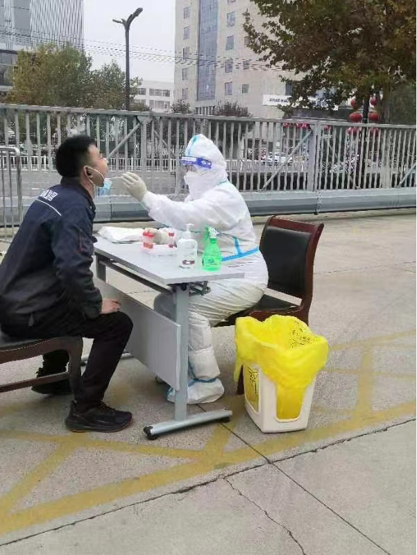 核酸檢測(cè)剛一開始,另一名志愿者因特殊情況不能參加采樣,第一產(chǎn)業(yè)園區(qū)的采樣任務(wù)都由袁茜茜一個(gè)人承擔(dān)。天氣漸漸變冷,每為一個(gè)員工采樣,就需要做一次手部消毒,采樣開始沒多久,袁茜茜的手就被凍麻木了,防護(hù)罩上不斷出現(xiàn)一層一層的水蒸氣,視線一片模糊……諸多困難,袁茜茜都咬牙堅(jiān)持了下來,面對(duì)日復(fù)一日的辛苦和危險(xiǎn),她無怨無悔,只想盡自己所能幫助他人、服務(wù)社會(huì)。