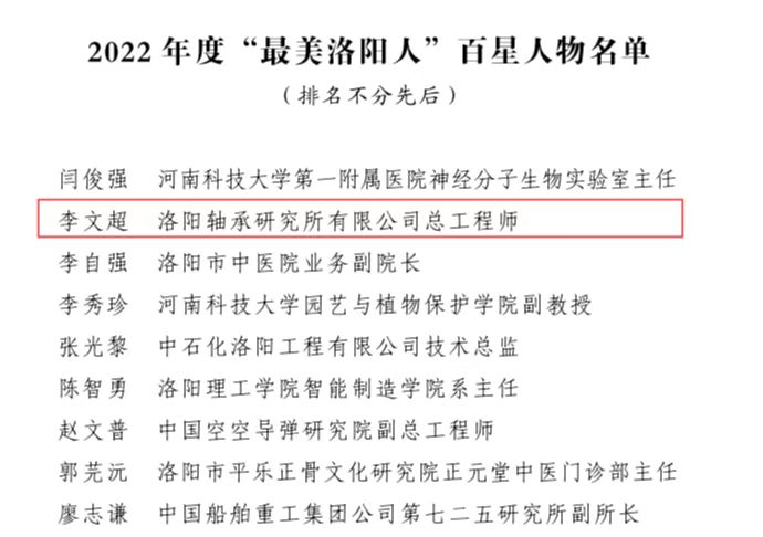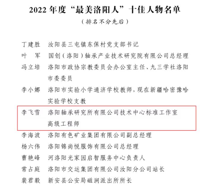 近日,洛陽市委宣傳部發(fā)布《關(guān)于表揚(yáng)2022年度“最美洛陽人”十佳百星人物的決定》,公司技術(shù)中心標(biāo)準(zhǔn)工作室李飛雪當(dāng)選“最美洛陽人”十佳人物,公司副總經(jīng)理、總工程師李文超當(dāng)選“最美洛陽人”百星人物。