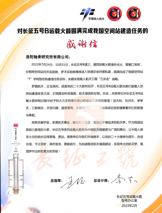 近日,軸研所收到長(zhǎng)征五號(hào)運(yùn)載火箭型號(hào)辦公室發(fā)來的感謝信,信中對(duì)軸研所為我國(guó)空間站建造過程中所做出的重要貢獻(xiàn)表達(dá)了衷心的感謝和崇高的敬意。