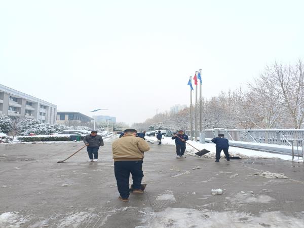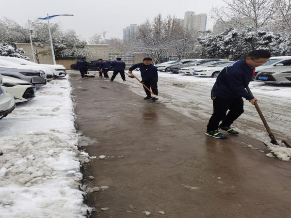經(jīng)過(guò)簡(jiǎn)單的分工部署,大家便拿著勞動(dòng)工具投入到了掃雪除冰工作中,揮舞著鐵锨、掃帚,干得熱火朝天,不亦樂(lè)乎,忙碌的身影構(gòu)成了一道亮麗的風(fēng)景線。盡管室外溫度很低,但大家勞動(dòng)的熱情和團(tuán)結(jié)的力量讓這個(gè)冬日變得格外溫暖。半個(gè)多小時(shí)的奮戰(zhàn),銀白的園區(qū)里處處閃耀著“黨員紅”,最終鏟出了一條洋溢著溫情的通暢道路。