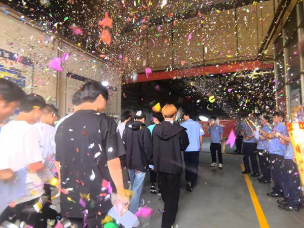 “嘭!嘭!嘭!”禮花筒錯(cuò)落響起,“歡迎!歡迎!熱烈歡迎”在精密部件事業(yè)部主軸部副部長何靈輝的帶領(lǐng)下,伴隨著漫天飄舞的彩帶,和熱烈的歡呼聲,新員工們踏入了主軸制造部。